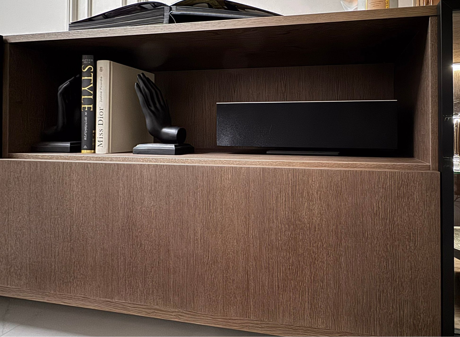 Innovativi divisori spostati consentono un facile collegamento dei dispositivi memorizzati nel mobile alle prese di corrente posizionate dietro di esso. Inoltre, le prese sono nascoste ordinatamente all'interno di una spaziosa sezione posteriore, consentendo al mobile di adagiarsi direttamente contro la parete.