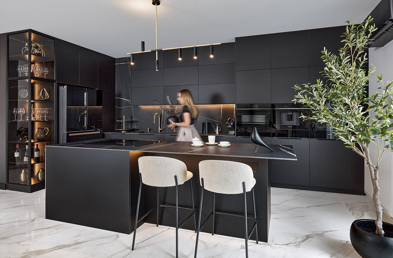 Natural oak veneer combined with light Marmorio sintered stone creates a space filled with harmony and calm. Integrated finger pulls and concealed internal systems highlight the minimalist character of the kitchen while ensuring full functionality.