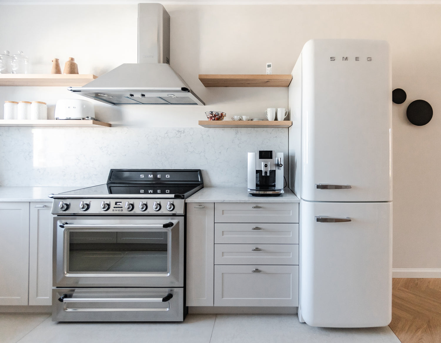 Fronty z białego akrylu oraz fronty z lakierowane z rowkami. Nowoczesny sprzęt Miele i Smeg oraz multiporty usprawniające codzienne użytkowanie.