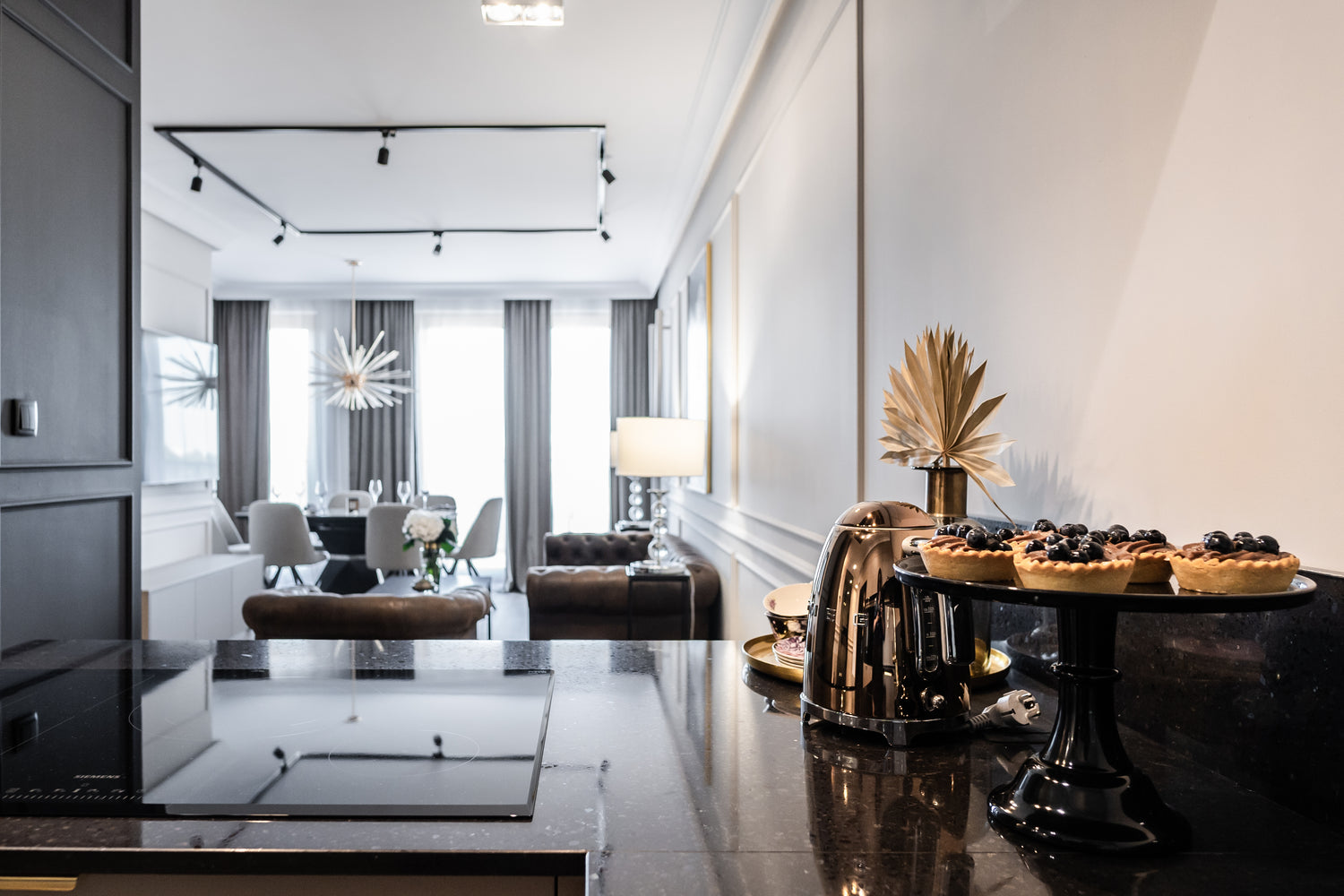 Kuchnia z frontami z satynowego akrylu w kolorze mokka, kamiennym blatem i biżuteryjnymi dodatkami. Zabudowa meblowa szaf, garderoby, łazienki oraz strefy RTV.