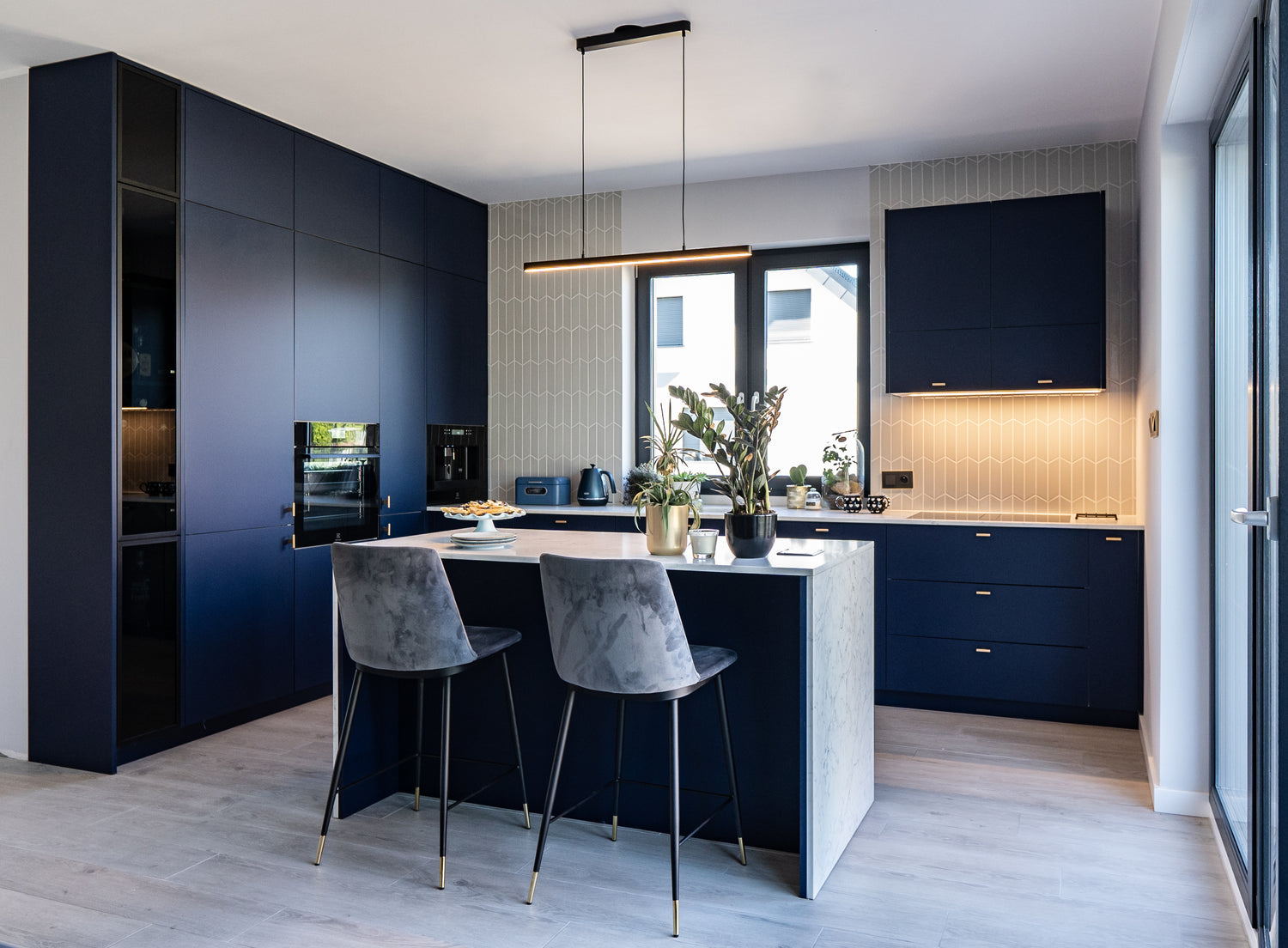 Fronty w granatowym akrylu, blaty wykonane z marmurowego konglomeratu do tego uchwyty T-bar to kwintesencja elegancji