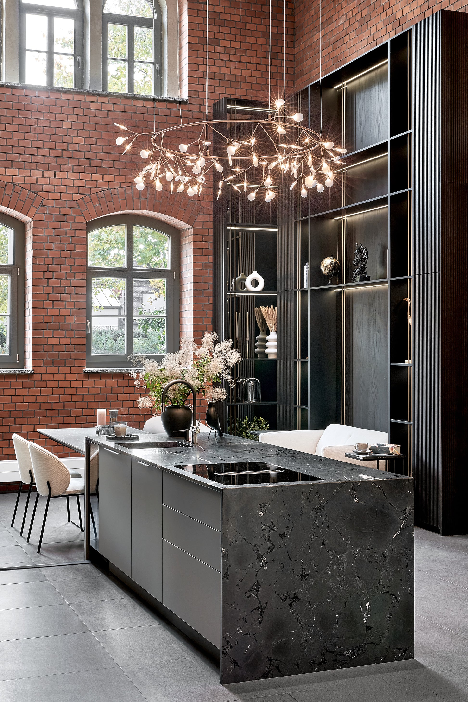 The Elite Kitchen Collection, brimming with geometric shapes and luxurious details, draws inspiration from the art deco design style while also paying homage to nature. Oak veneer and acrylic fronts in a delicate mocha hue characterize the collection. Our attention is captivated by the natural and incredibly durable quartzite countertop, while the black brushed edge handles underscore the modern character of the furniture. A glass-fronted cabinet with geometric divisions inside and aluminum accents, such as the cabinet frame and gold-toned tubes, exude modern luxury with an industrial touch.