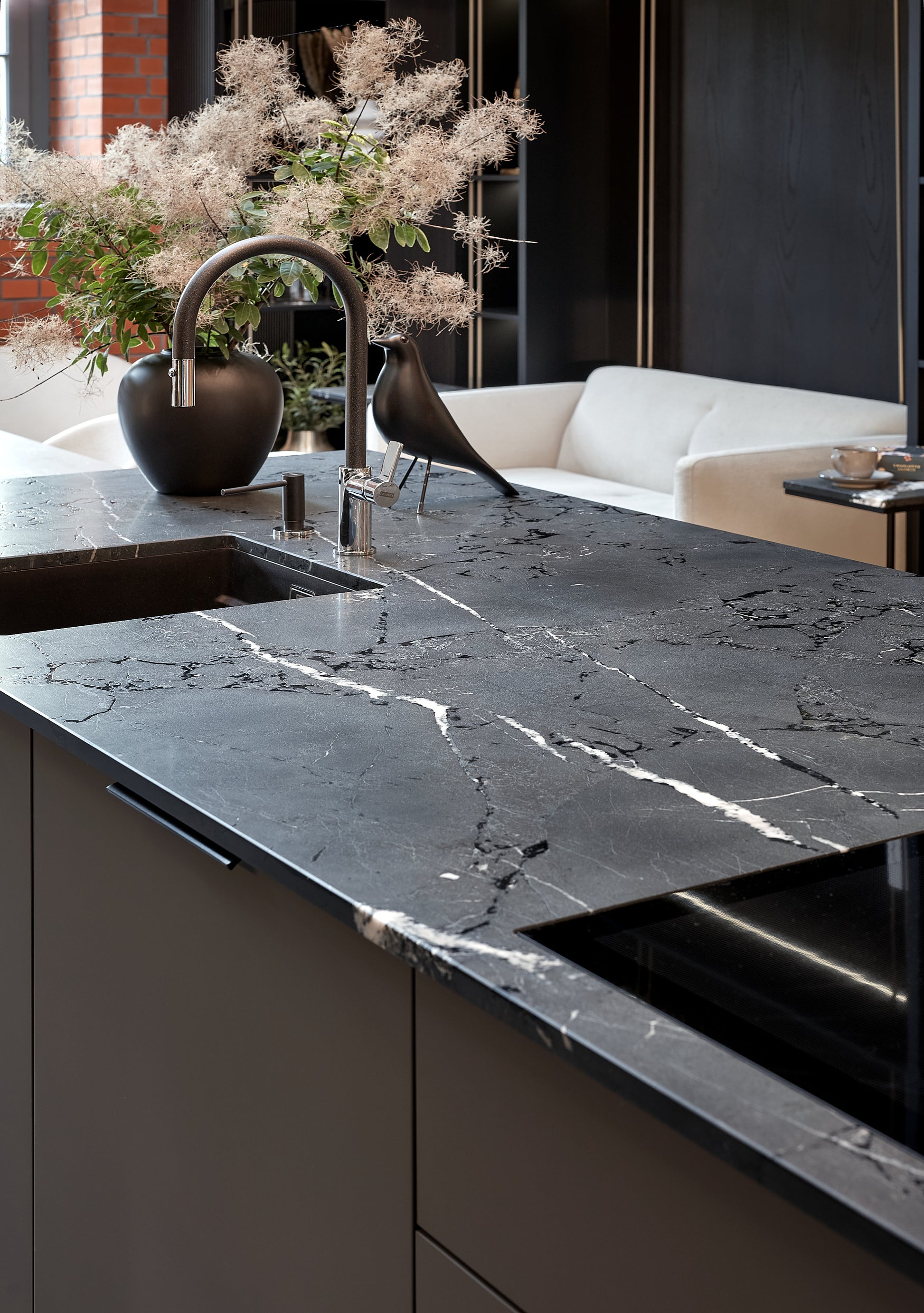 The niche above the quartzite countertop demonstrates meticulous attention to detail, showcasing a seamless transition from the countertop to the wall, resulting in a visually cohesive and monolithic design. The execution of features such as the countertop connections to the island side and the suspended stone sink exemplifies precision and skill.